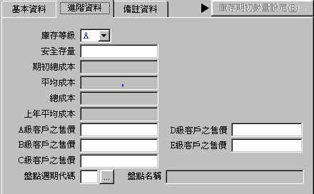 | 庫存等級 | : | 庫存等級是其中一種分類方法,使用者可自行分類商品級別。 | | 安全存量 | : | 使用者可為每件商品設定安全存量,當現量少於安全存量時,系統便會自動提示使用者及早採購商品。 | | 期初總成本 | : | 上年度自動帶入之該商品總成本。 | | 平均成本 | : | 目前商品的平均成本,自動由交易中計算。 | | 總成本 | : | 目前商品的庫存總成本,系統自動由交易中計算。 | | 上年度平均成本 | : | 該商品上年度的平均成本,作參考用途。 | | 客戶等級售價 | : | 由A~E級,當該等級客戶銷貨時會自動取回等級售價。 | | 盤點週期 | : | 為該商品設立盤點時間,作參考用途。 | | 備註 | : | 備註欄位沒有長度限制,您可以輸入任何資料。 |